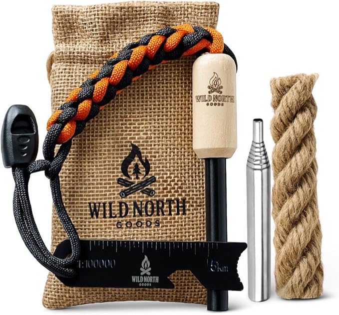 • All-in-One Survival Fire Starter Kit, Compact, Reliable & Adventure-Ready: Carry everything you need to spark a fire in one rugged kit: ferro rod with wooden handle, 6-in-1 multi-tool striker, waxed tinder rope, collapsible bellow, paracord, and burlap pouch. Lightweight and travel-friendly, perfect for camping, hiking, bushcraft, or emergency survival gear.